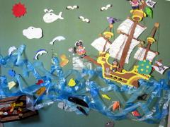 海です。海と言えば「海賊」!。海賊船に乗って、読書の航海へでかけるぞっ。夏の暑さの中で、木陰や家の中の風通しのよい、涼しい場所で、楽しい本の世界にひたれるといいなぁと思います。