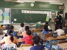 | 初めて見る先生達がたくさんいます。霧一小、霧三小の先生達です。来年度から霧が丘小として英語活動をやるので、その参考にと霧二小で英語活動の参観をしました。子どもたちAETやサポーターの人達と一緒にはりきって楽しく英語活動を行いました。 |