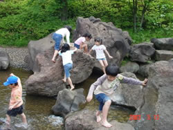 | はじめての遠足は、「四季の森公園」へ行きました。じゃぶじゃぶ池では裸足になって大きな岩を渡ったり、水の中に入ったりしました。他にもローラーすべり台やブランコなどもあり、思い切り遊びました。 |