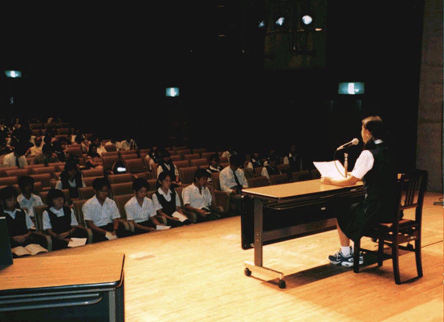 | 【アナウンス部門】 原稿内容は、学校のニュースや話題等、中学校生活の中から生まれた生徒の考えを400字詰め原稿用紙1枚以内にまとめアナウンスする。アナウンスする前に、学校名、氏名を述べること。 | ![]() |