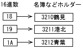 図で、説明します。16進数のホルダーを別の名前で、 新しい名前のホルダー製作しなおす。右の例では、 16進数の18が → 3210鶴見 16進数の1Aが → 3212青葉 にホルダー名が変更されてコピーされた事になっています。 |