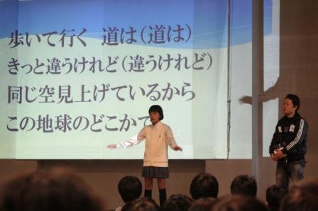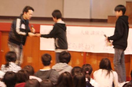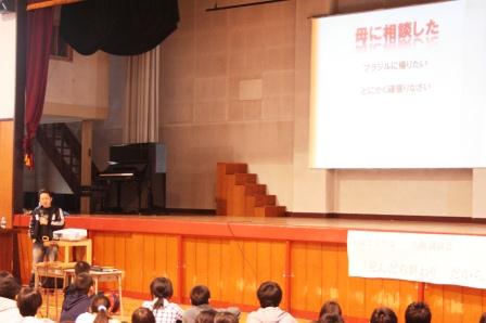 |   「だから生きるんだ」のテーマで、具志アンデルソン飛雄馬さんによる人権講演会を開催しました。 具志さんは、ブラジルサンパウロ出身の日系3世で、現在「多文化共生NPO世界人」の理事長として、全国で講演活動などをされている方です。 小学校の時に来日し、ご自身が小・中学校で受けたいじめや自暴自棄になり荒れた体験、また仕事で受けた差別、そしてそういう苦悩の生活から 自分自身を取り戻し、今に至る経緯などを話されました。1時間の講演会は、楽しく笑いに包まれたり、全校の生徒たちが真剣なまなざしで具志さんを見つめたりと、 とても素晴らしい時間となりました。「現実から逃げるな。そこから道が開ける」など、大変な苦労をされてきた具志さんの言葉だからこそ、私たちの胸に響きます。 |