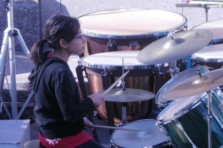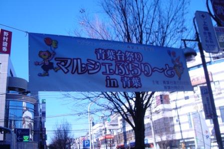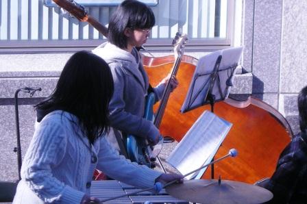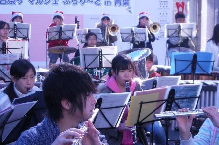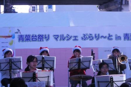 昨日の12月1日(日)は青葉台駅前バス通り沿いの歩道で『2013青葉祭り マルシェぶらり〜と in 青葉』が開催されました。 吹奏楽部は、10時からのオープニングセレモニーのあと、嵐の「ワイルドアットハート」やクリスマス曲「そりすべり」など、5曲を披露しました。沿道には、 音を聞いて足を止める人など、100人以上の観衆で大盛況でした。