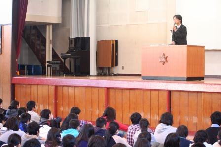 |   25日(水)に2学期の終業式を行い、12日間の冬休みに入りました。 終業式では、2学期を振り返り学校全体の様子として、行事の取組など充実した日々を送れたことを話しました。 特に、合唱コンクールの取組と当日の発表は、全校が大変に素晴らしかったことを称え、学習面では全国と横浜市の学力調査 (ともに3年生)の結果が、いずれも高いレベルにあることを報告しました。また、青葉台中学校の良さは、生徒たちがやるべきことを きちんとやり、ルールやマナーをわきまえている所であるという話をしました。最後に女子マラソン選手で、オリンピック2大会 連続のメダリスト有森裕子さんの経歴を紹介し、継続することの大切さに触れました。  平成25年も残りわずかとなりました。 生徒たちには、各自が2学期と今年1年間を振り返り、新たな決意をもって新年を迎えてほしいと思います。地域・保護者の皆様には、今年1年間、 本校へのご理解とご協力ありがとうございました。新しい年が皆様にとって、そして全校の生徒たちにとって佳き年でありますよう心よりお祈り申し上げます。(校長) |