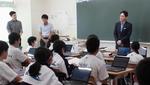 正門のところで、小学生の登校風景を見ながら、たくさんの児童に声をかけてくださいました。その後は、校長と懇談し、義務教育学校としての本校の特色について興味深く聞かれていました。その後見学した1時間目の7年生の英語の授業の冒頭に、ご自身で英語の自己紹介をし、メッセージも語ってくださいました。小学生のフロアでは、小学校1~2年生の教室にも顔を見せてくれました。児童生徒も突然の来訪に驚き、嬉しそうにしていました。
