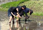 晴天の下、午前中は田植えを行いました。泥だらけになりながら、間隔を見て丁寧に頑張りました。