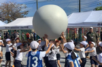 全校競技では、「アツアツ あげあげコロッケ(大玉送り)」をしました。みんなで力を合わせて、校長先生にコロッケを作りました。