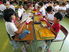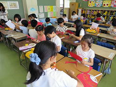 2015.5.26(火) 「6ねんせいのおにいさん、おねえさん、ありがとう」 うんどうかいでつかうおうえんようのうちわを、6ねんせいのおにいさん、おねえさんといっしょにつくりました。つくりかたをおそわったので、2ねんせいになったら、じぶんたちだけでつくることができるね! |