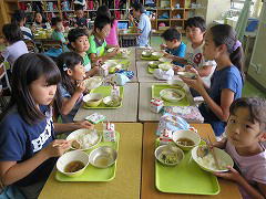 2015.6.30(水) 「ふれあいきゅうしょく」 6ねんせいのおにいさん、おねえさんといっしょに、きゅうしょくをたべました。たのしくおはなししながらたべました。ひるやすみは、こうていで、おにごっこなどをしてたのしみました。6ねんせいは、あしがはやいです。 |