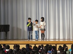2015.12.16(水) 「藤の木フェスタ発表しょうかい」 1組『世界中のみんなが笑顔になるためには?』、2組『よんにー先生の体験授業~安全と安心を守ろう~』、3組『2015 愛川ガイドツアーへLet's go!』という内容です。 |