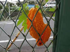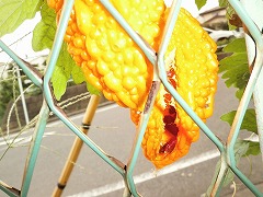 2015.8.25(火) 「ゴーヤ」 この前まで青々としていたゴーヤが、黄色やオレンジ色に。中には、もうわれている物もありました。 |