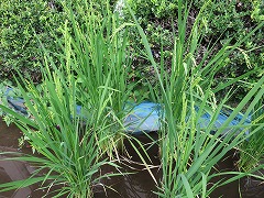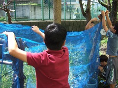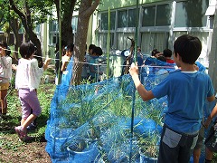 2015.9.11(金) 「藤の木小米を守ろう!」 藤の木米が育っていますが、カラスやスズメに食べられているようです。ネットをはったり、CDをつるしたりして対策をしました。かかしも作っています。グループで意見を出し合い、協力して進めることができました。 |
