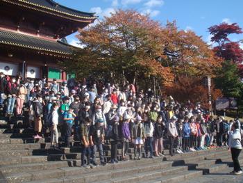 2日目は朝から快晴で暖かな1日になりました。東照宮辺りの紅葉もちょうど見頃でした。土曜日ということもあり、10時ごろになると、各社寺の前には行列ができ始めていました。写真は一番最初に見学した輪王寺の前で、6年生101人が集合して記念撮影をしようと準備しているところです。