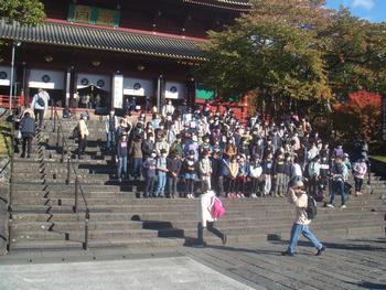 6年生が1泊2日で日光に行ってきました。1日目はバスでいろは坂をのぼり、滝めぐりをしました。紅葉のシーズン真っ盛りということで、かなりの観光客でにぎわっていました。2日目は輪王寺、東照宮を見学しました。こちらも、到着した朝の頃は良かったのですが、時間の経過とともにどんどん観光客が増えてきました。しっかりお土産も買い、思い出に残る2日間になりました。写真は輪王寺前で学年の集合写真を撮影する準備をしているところです。
