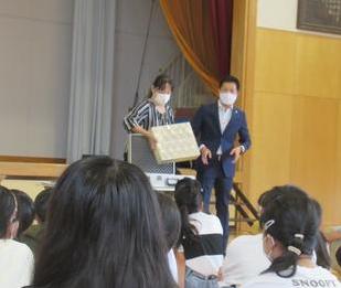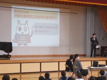 税理士の方に来ていただき、租税教室を行いました。そもそも税金とは何なのか。税金はどんなことに使われているのかなどスライドを使って分かりやすく教えていただきました。社会の授業で学習したことから、更に理解が深まる1時間となりました。