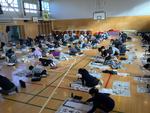 学年全体で集まり、体育館で書初めを行いました。6年生は「将来の夢」と書きました。全体のバランスに気を付けながら、のびのびと書くことができました。