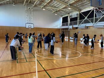 まずは、ボールを使ったミニゲーム。ドリブル鬼ごっこやシュート練習で、バスケットボールの基礎の感覚をご指導いただきました。そして後半、グループに分かれてゲームを行いました。