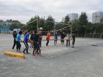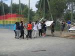 校庭のサッカーゴールや移動式のバスケットゴールは校庭の隅に移動して、会場づくりを進めています。