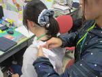 職員は、年に一度、養護教諭の指導のもと、負傷者への対応研修を行っています。