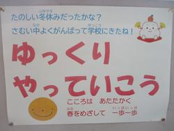1月7日、子どもたちが元気に登校してきました。口々に「おめでとうございます。」「おはようございます!」と。中には、「今年はうま年だから『うま』くいくよ!」なんて言ってくれる子も。各クラスの黒板には子どもたちを迎えるメッセージも。
