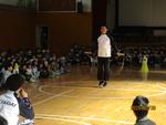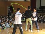 最初に、3人の職員によるなわとびの試技。子どもたちからも拍手が起きました。続いて、日本体育大学の学生さんのなわとびの試技、披露。