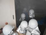 消防署の入船出張所にご協力いただき、理科室では煙の中を歩く体験をしました。実際の煙とは違うものでしたが、理科室の中はもちろん、廊下まで空気が白くなっていました。タオルや腕で口や鼻を覆い、姿勢を低くして、なるべく吸い込まないように気を付けて進みました。前が見えにくいので、片手で行く方向を探りながら進みました。