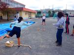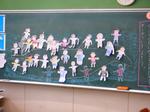 1年生の教室では国語の学習をしていました。くじらぐもにのる子どもたちを想像しよう、というめあての授業でした。クラスのみんなで一つの輪を作り、「天までとどけ 1、2、3!」と声を合わせてジャンプをしながら想像し、読みを深めていました。とても生き生きとした表情が印象的でした。