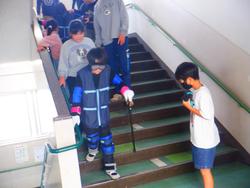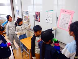 泉中央地域ケアプラザや泉区福祉協議会のみなさん、保護者ボランティアの方々のご協力のもと、4年生が高齢者疑似体験を行いました。視界が曇るゴーグルをつけたり、ひじやひざ、足首などに重りを付けたり、軍手をはめたりしながら高齢者の疑似体験をしました。子どもたちは見えづらさや歩きづらさ、つかみづらさなどを体験しながら、想像以上に高齢者の方々が不自由な生活をしていることを実感していました。