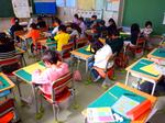 2年生のクラスでは、一生懸命に九九を覚えようと、それぞれの段を唱えてました。完全マスターまでもう一息です。となりのクラスでは、AETのニコラス先生の色や形など英語でのヒントをもとに、どんな果物を説明しているのか予想し、進んで答える姿が見られました。理科室では、4年生が温められた水がフラスコ内でどう変化しているのか、タブレットを使って自分の考えを図に表していました。