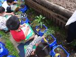 「ミニトマトの葉っぱはトマトのにおいがするよ」「葉っぱがとげとげする」「小さいつぼみがあるよ」などなど、