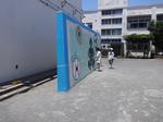 3年生が算数の長さの学習で、巻き尺を使って、校庭でいろいろな物の長さを測っていました。