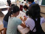 家庭科室で、削った石鹸にお湯やオイルを混ぜて作成中です。