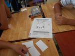 ラーメン店のカウンターに座った客の席を、各自に配られたヒントカードをもとに話し合い、予想します。