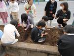 教室の前の花壇にうねを作り、みんなで分担して小松菜やほうれん草の種をまいていました。