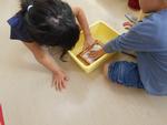 牛乳パックをもとに、水に浸して柔らかくしたり、ミキサーで細かく砕いたり、紙をすいたり、乾かしたり、といろいろな工程に友達と協力して取り組み、はがき大の和紙ができました。