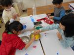 プリンカップの底や洗濯ばさみ、プチプチなどに絵の具を付けて画用紙にペッタンして楽しんでいました。