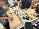 下絵を版木に写し、安全に気を付けて彫刻刀で彫っていました。