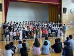 体育館で4年生、6年生の前で「北風こぞうのかんたろう」の歌を披露しました。