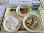 今日の給食は「ごはん、たらちり、かぼちゃのそぼろあんかけ、焼きのり、牛乳」でした。