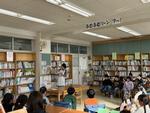 1年生が図書の時間、図書室で学校司書の読み聞かせを楽しんでいました。