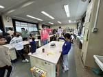 ガスコンロで空気を温め、教室の上の方と下の方の温度を確かめていました。