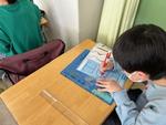 初めてカッターナイフを使う子も多いので、けがのないように、持ち方や切り方など、安全指導をしています。