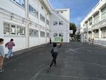 体育館でバスケットボールのフリースローや、校庭で長縄に取り組んでいて、賑わっています。