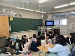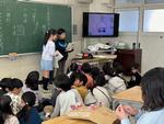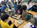 2年生を教室に招き、タブレットとテレビを使って、どんな学習なのか、その楽しさなどを伝えました。