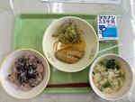 メニューは、赤飯、さわらのあんかけ、磯香和え、かきたま汁、牛乳 でした。