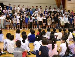 今年度初めての音楽集会がありました。今回は、2・4・5年生が集まる会です。はじめに5年生が「君をのせて」の合唱を発表し、その後、2・4・5年全員で今月の歌「YUME日和」を歌いました。