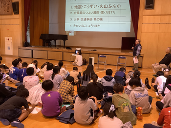 社会科「災害から人々を守る活動」の学習の一環として、地域防災委員の方に来ていただき、お話を聞きました。地域の方が協力して、災害に備えて準備や訓練をしていることが分かりました。