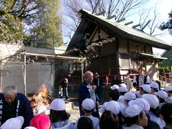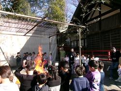 神橋小のすぐ隣にある杉山神社で地域の方々が行っている「どんと焼き」におじゃましました。「火で顔が熱い!」「燃えた灰が、あんなに高く空に上がっているよ。」と子どもたち。