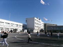 校庭では、1年生が凧揚げをしていました。「見て見て!あがったよ!」と叫びながら走っています。