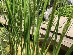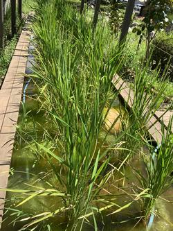 夏の暑さを受けて、公田米が大きく育っています。いつの間にか公田米にも小さく、かわいらしい稲の花が咲きました。